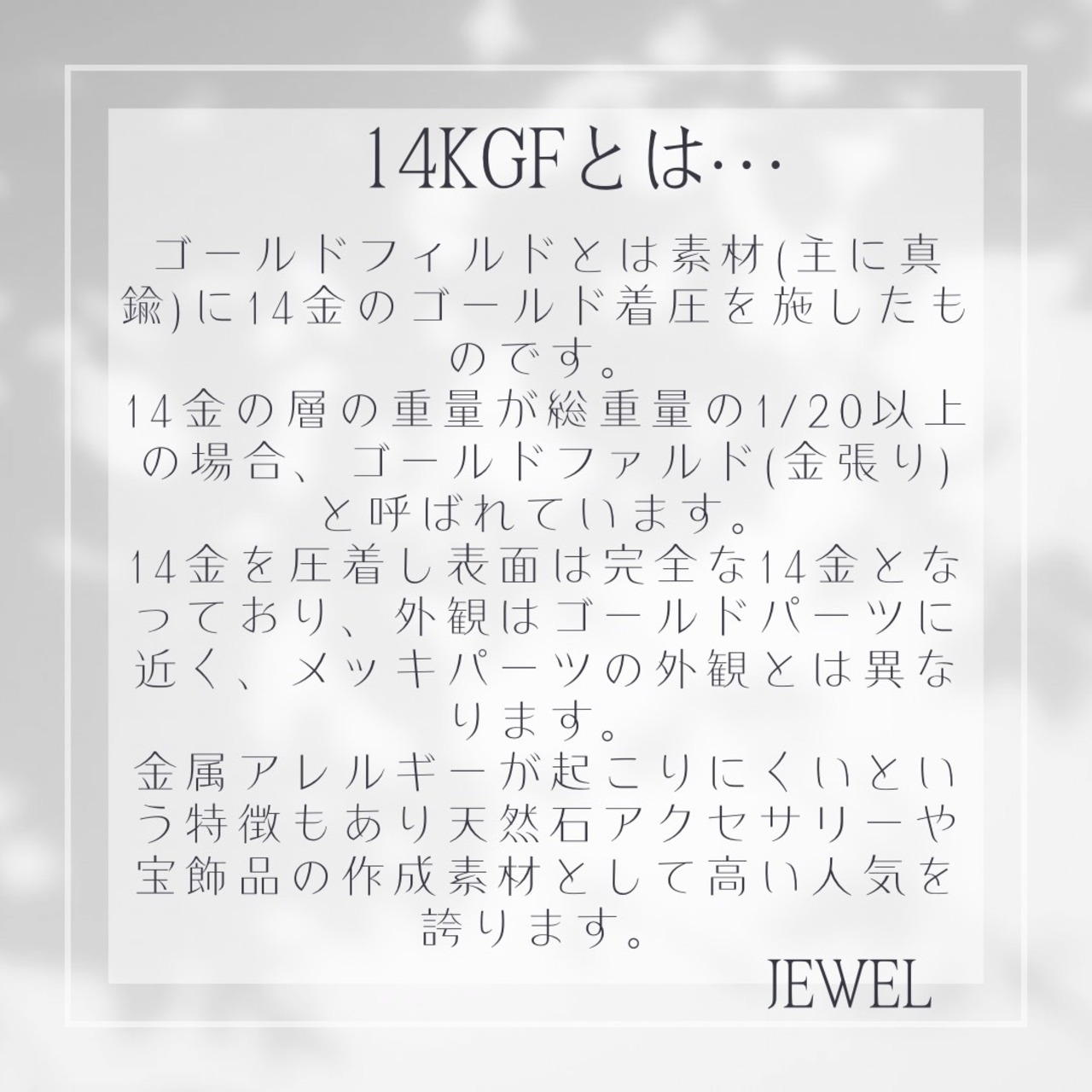 ゴールドフィルドとは素材(真鍮)に14金のゴールド圧着を施したもので、その金の重量が総重量の20分の1以上の場合、ゴールドフィルド(金張り)と呼ばれます。金メッキよりも丈夫(剥がれにくい)という特徴があります
