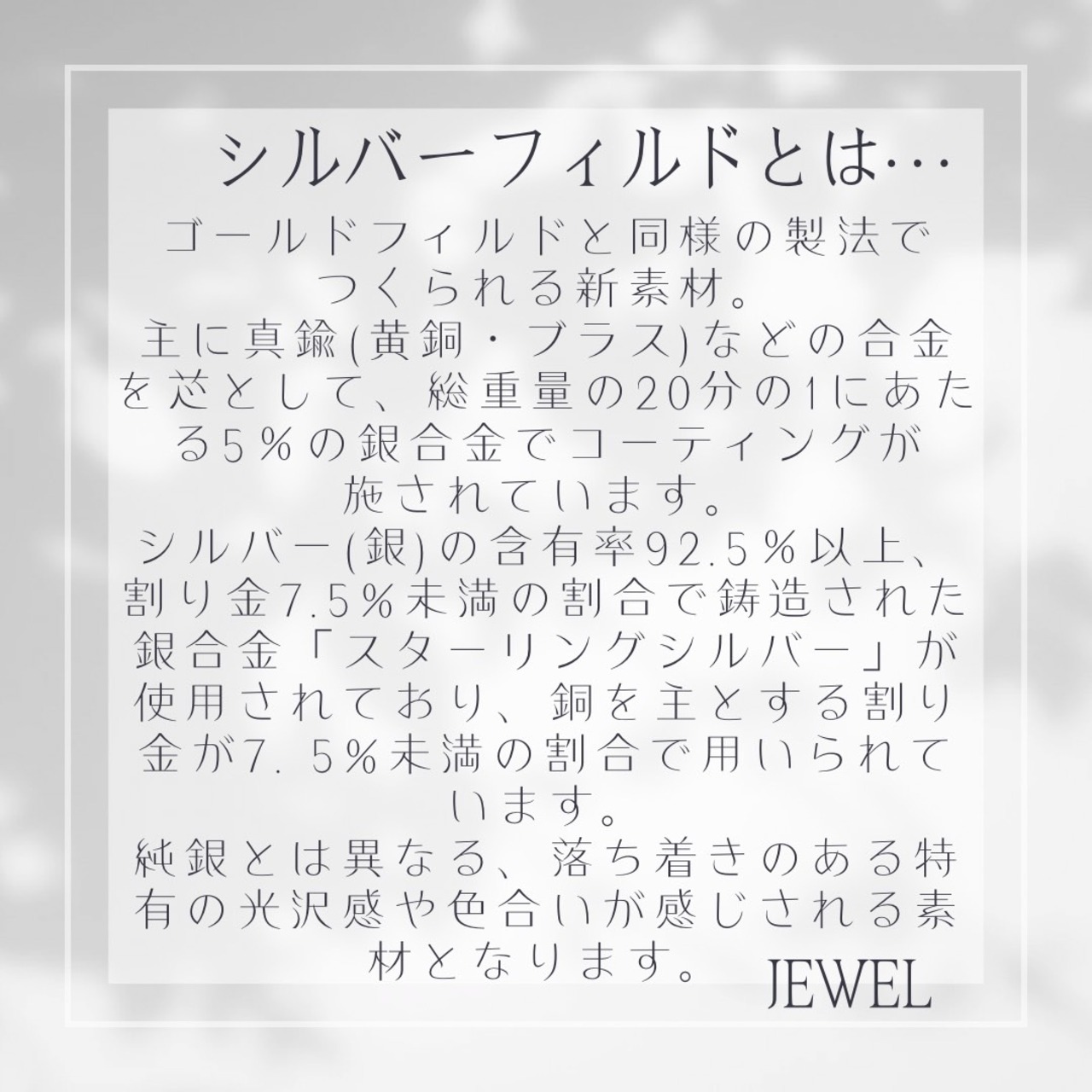 アクセサリー素材として人気の高いゴールドフィルドと同様の製法でつくられる新素材のことで、主に真鍮(黄銅・ブラス)などの合金を芯として、総重量の20分の1にあたる5%の銀合金でコーティングが施されています。