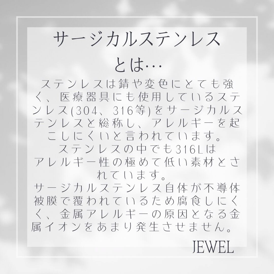 ステンレスの中でも316Lはアレルギー性の極めて低い素材とされています。 サージカルステンレス自体が不導体被膜で覆われているため腐食しにくく、金属アレルギーの原因となる金属イオンをあまり発生させません。